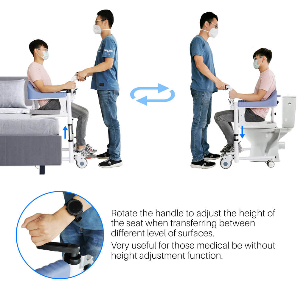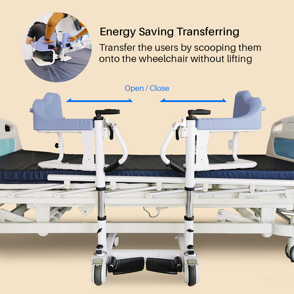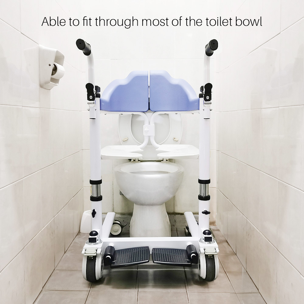 Functions as a commode chair and a patient transfer aid, simplifying movement between beds, toilets, and other seating areas.