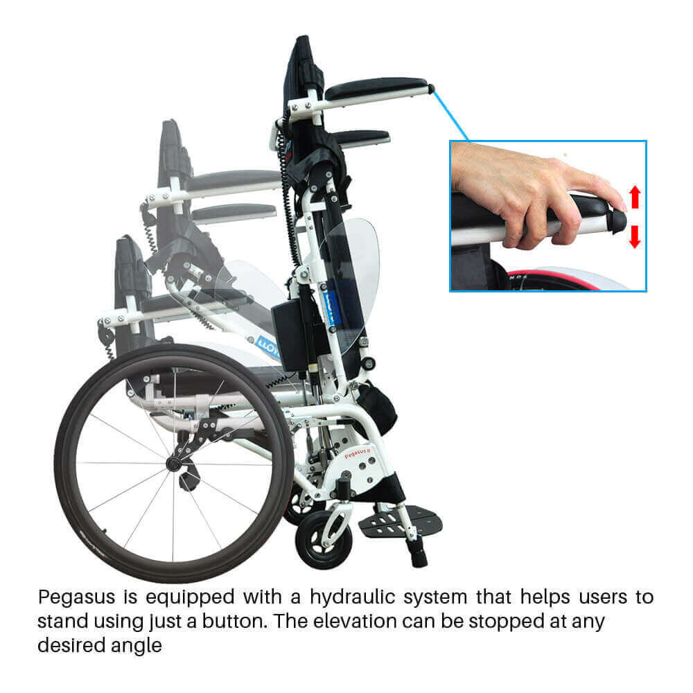 If you like the idea of our standing wheelchair Leo, but lacks the strength from palms and fingers, you can use Pegasus. You need to use one finger to control the stand/sit movement.