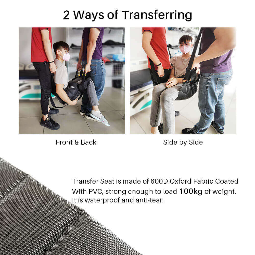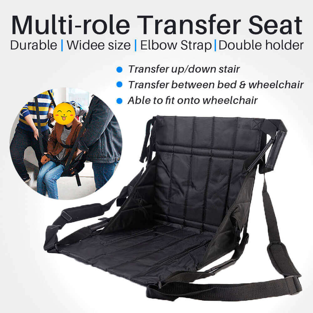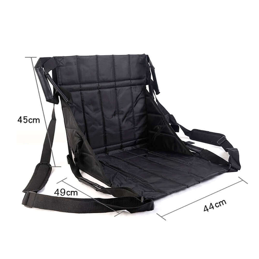 The Portable Transfer Seat is a waterproof, foldable solution for safe transfers between beds, wheelchairs, car seats, or airplane seats. Made from durable 600D Oxford fabric with PVC backing, it supports up to 90 kg and includes handles and shoulder straps for secure two-person lifting.